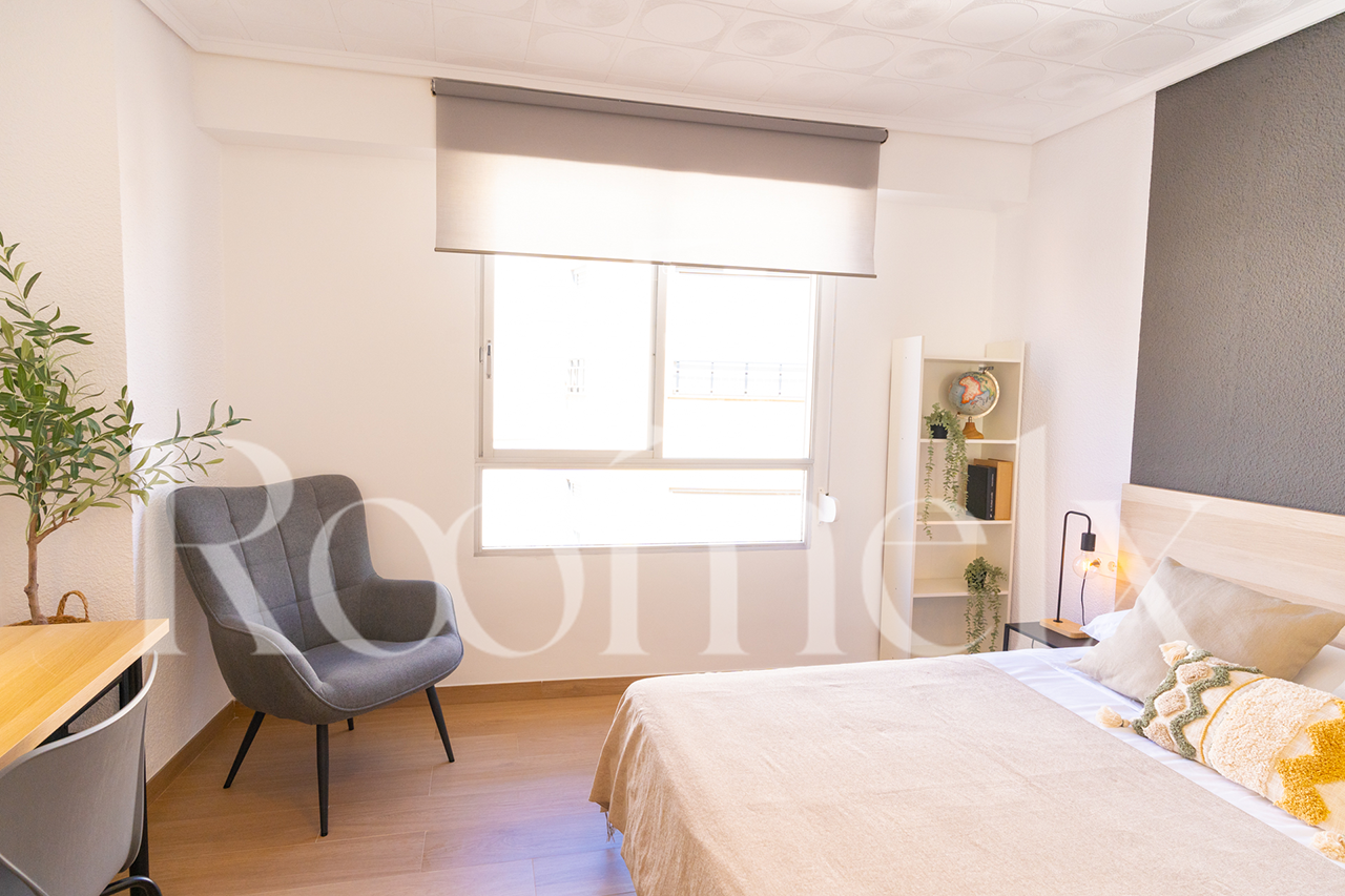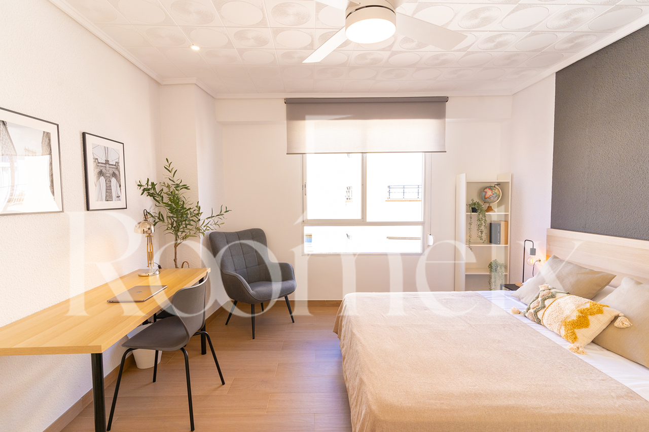 Se trata de una amplia y luminosa habitación con ventana al exterior. Esta habitación está equipada con un armario con espejo, una cómoda, mesita de noche, un gran escritorio con su silla y una lámpara de flexo, una estantería y un sillón para una mayor comodidad. La cama de 150 cm con colchón viscoelástico que garantizará un sueño reparador.